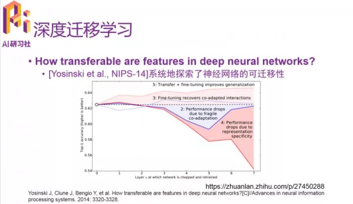 下面看下最近的一些工作,14年有一篇论文探讨了神经网络的可迁移性,横轴是层数,纵轴是精度。