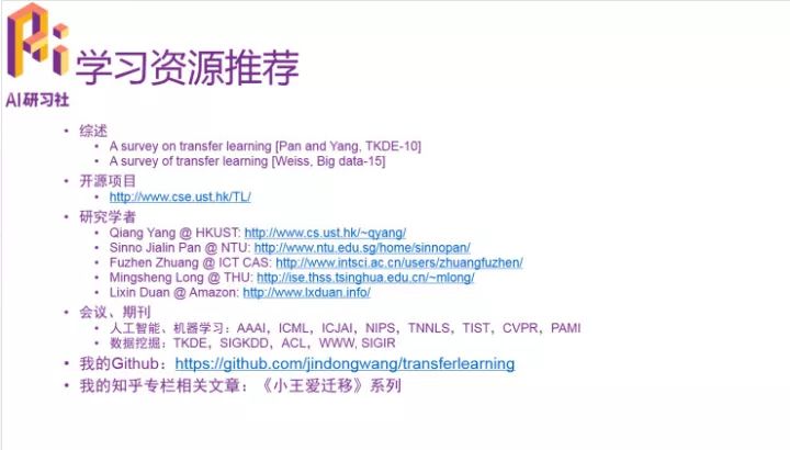 下面给大家推荐一些学习资源,前面是比较经典的两个综述,第一个是杨强老师的。下面也给大家推荐一些比较知名的学者、会议、期刊等。最后是我的GitHub,在持续更新,我的知乎专栏是《小王爱迁移》,欢迎大家投稿。