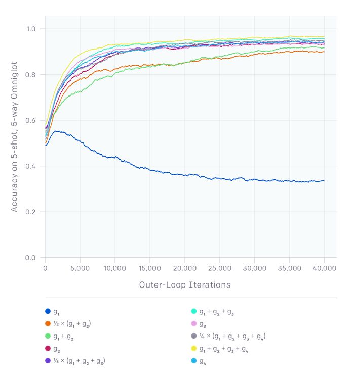 下图显示了在 Omniglot 上由梯度之和作为元梯度而绘制出的学习曲线。g2对应一阶MAML,也就是原先MAML论文中提出的算法。由于方差缩减,纳入更多梯度明显会加速学习过程。需要注意的是,仅仅使用g1(对应k=1)并不会给这个任务带来改进,因为零样本学习的性能无法得到改善。