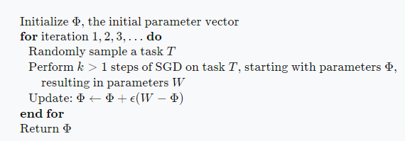 像MAML一样,Reptile试图初始化神经网络的参数,以便通过新任务产生的少量数据来对网络进行微调。