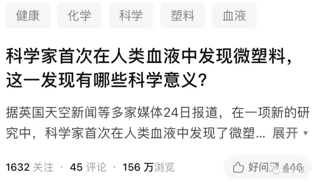 一则人类血液中首次发现微塑料的消息引发网友热议,一度登上知乎热榜第3,微博阅读量更是达到2.4亿。