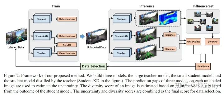 作者发现现有的主动学习方法在车道检测方面表现不佳,原因是两方面的。一方面,大多数方法基于熵来评估数据不确定性,这在车道检测中是不可取的,因为它鼓励选择车道很少甚至根本没有车道的图像。另一方面,现有的方法没有意识到车道标注的噪声,这是由严重遮挡和车道标记不清晰引起的。在本文中,作者构建了一个新颖的知识蒸馏框架,并基于student模型所学的知识评估图像的不确定性。作者表明,所提出的不确定性度量克服了上述两个问题。为了减少数据冗余,作者研究了图像样本的影响集(influence set),并提出了一种新的多样性度量。最后,作者结合了不确定性和多样性指标,提出了一种用于数据选择的贪婪算法。