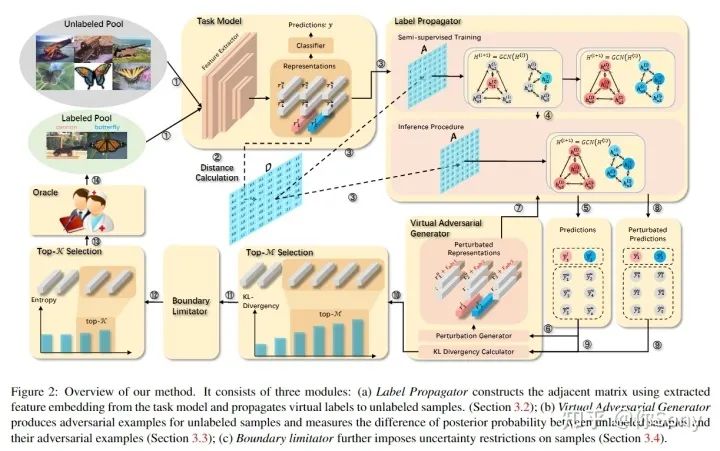 尽管当前主流方法开始结合 SSL 和 AL(SSL-AL)来挖掘未标记样本的多样化表示,但这些方法的全监督任务模型仍然仅使用标记数据进行训练。此外,这些方法的 SSL-AL 框架存在不匹配问题。在这里,作者提出了一个基于图的 SSL-AL 框架来释放 SSL 模型的能力并进行有效的 SSL-AL 交互。在该框架中,SSL 利用基于图的标签传播为未标记的样本提供伪标签,渲染 AL 样本的结构分布并提升 AL。AL 在决策边界附近找到样本,利用对抗性示例帮助 SSL 执行更好的标签传播。闭环中的信息交换实现了SSL和AL的相互增强。