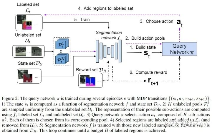 在本文中,作者感兴趣的是基于池的方式进行人工标记工作,最大限度地减少这种工作,同时最大限度地提高分割模型在测试集上的性能。作者提出了一种新的基于深度强化学习 (RL) 的语义分割主动学习策略。智能体学习一种策略,从未标记的数据池中选择一小部分信息丰富的图像区域进行标记。区域选择决策是基于被训练的分割模型的预测和不确定性做出的。作者的方法提出了一种用于主动学习的DQN,使其能适应大规模的语义分割问题。作者在 CamVid和大规模数据集 Cityscapes 中测试。在 Cityscapes 上,在相同性能下,作者的基于深度强化学习的区域的 DQN 方法比最具竞争力的基线减少大约 30% 的额外标记数据。此外,作者发现与基线相比,作者的方法选择了更多代表性不足的类别标签,从而提高它们的性能并有助于减轻类别不平衡。
