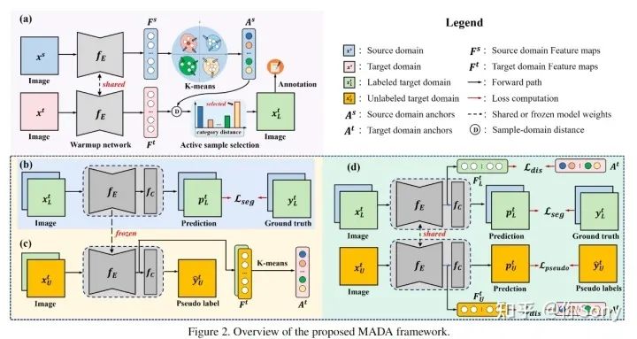 将目标域的分布无条件地与源域对齐可能会扭曲目标域数据的特有的信息。为此,作者提出了一种新颖的基于多锚点的主动学习策略,以协助域自适应语义分割任务。通过创新地采用多个点而不是单个质心,可以更好地将源域表征为多模态分布,实习从目标域中选择更具代表性和互补性的样本。手动注释这些样本的工作量很小,可以有效缓解目标域分布的失真,从而获得较大的性能增益。另外还采用多锚策略来对目标分布进行建模。通过软对齐损失,对多个锚点周围紧凑的目标样本的潜在表示进行正则化,可以实现更精确的分割。