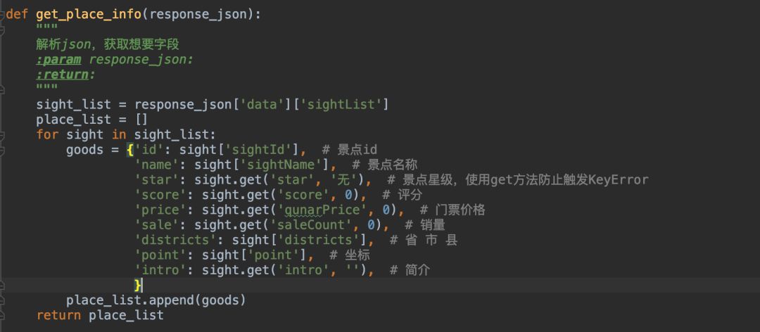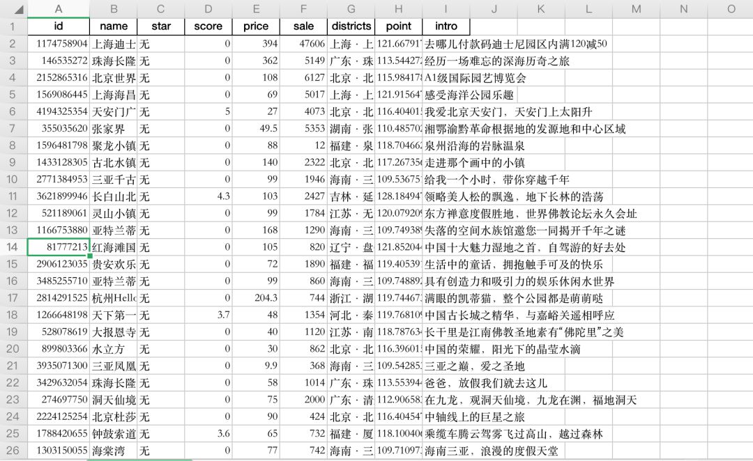 这里猪哥提取了:id、名称、星级、评分、门票价格、销量、地区、坐标、简介这些信息,基本有效信息都保存起来!