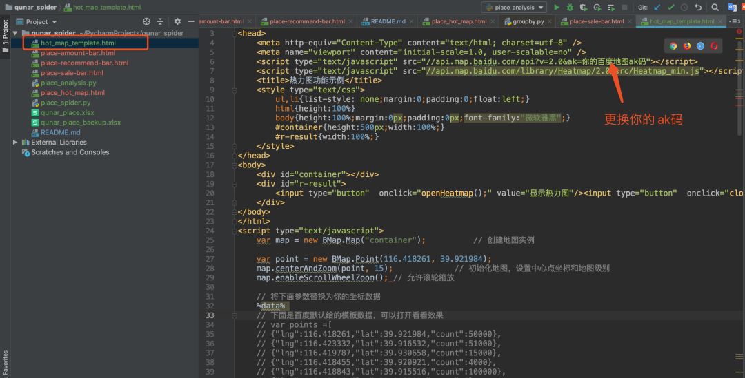 然后你就可以下载一个百度热力图的demo的html,在html中把ak码换成自己的。
