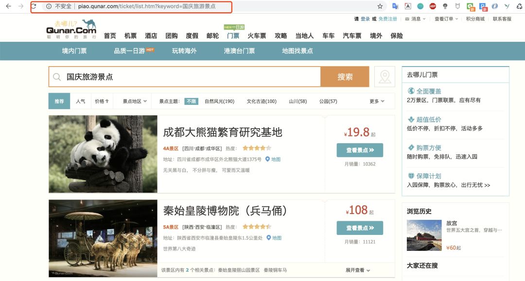 (http://piao.qunar.com/ticket/list.htm?keyword=)搜索:**国庆旅游景点**,就可以看到推荐的景点的一些信息,如:名称、地区、热度、销量、价格、等级、地理信息等等,信息应该说是比较全,良心!