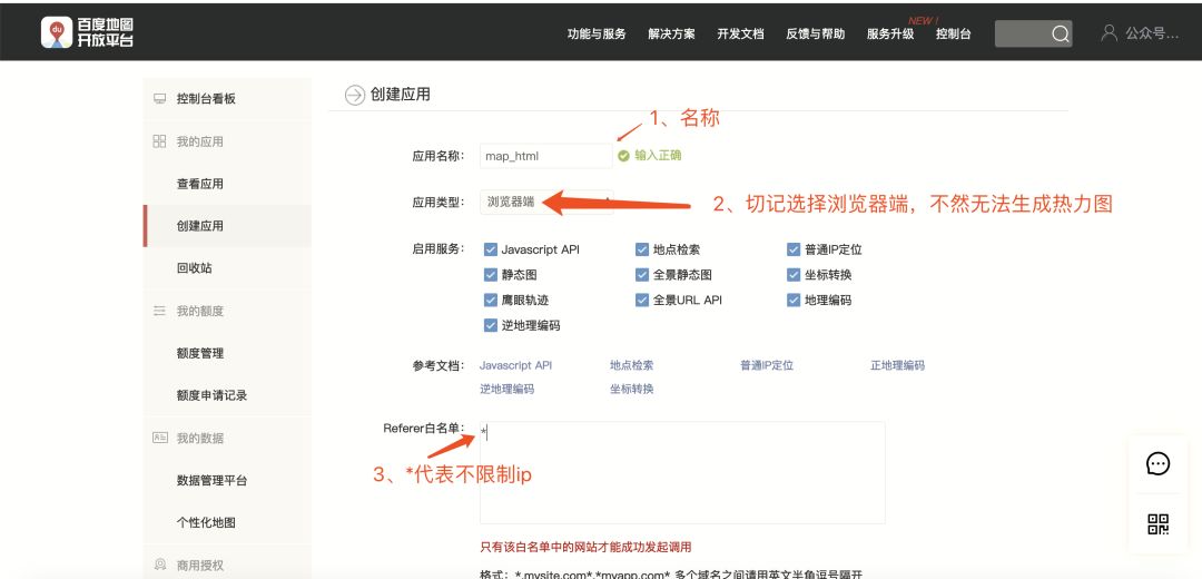 需要注意的是:在申请应用的时候类型一定要选浏览器