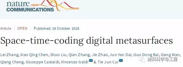 近日,东南大学毫米波国家重点实验室崔铁军教授课题组在信息超材料领域取得新进展,研究成果以“Space-time-coding digital metasurfaces(时空编码数字超表面)”为题,10月18日在线发表于《自然通讯》(Nature Communications)。东南大学为第一署名单位,崔铁军教授为论文通讯作者,博士生张磊为第一作者,意大利Sannio大学的Vincenzo Galdi教授为共同通讯作者。合作者还包括崔铁军教授课题组的硕士生陈晓晴、博士生刘硕、张茜、赵捷、戴俊彦、白国栋;万向副教授、程强教授,以及意大利Sannio大学的Giuseppe Castaldi教授。