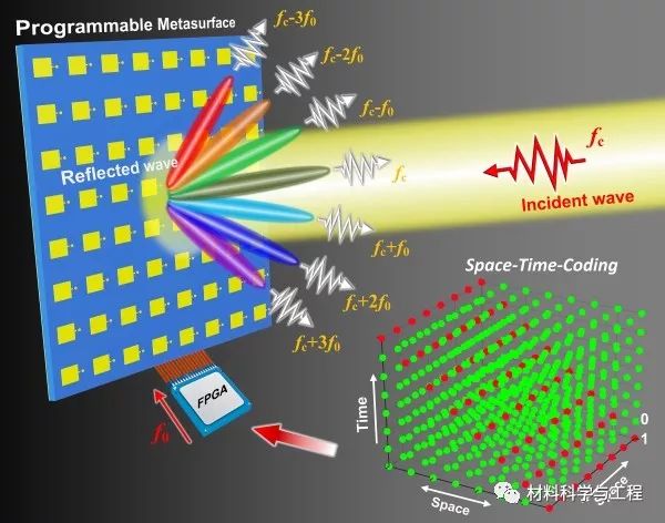然而,之前关于数字编码与可编程超材料的研究工作仅在空间域进行编码。近来,东南大学毫米波国家重点实验室程强教授、崔铁军教授和东南大学移动通信国家重点实验室金石教授及其博士生赵捷、阳析等提出时间编码超材料的概念(arXiv 1806.04414),可对电磁频谱进行任意调控。在该Nature Communications论文中,崔铁军教授等人首次提出了“时空编码数字超表面”,特殊设计的可编程超表面在时间域上按照相应的时间编码序列快速切换,可以在频率域产生谐波能量分布。同时结合空间域的编码排布,一款时空联合编码的数字超表面可以在空间域和频率域同时调控电磁波。