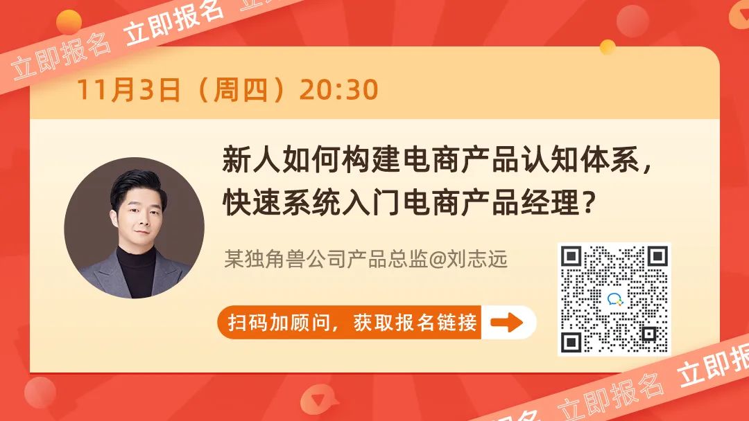 11月3日(周四)晚8点半,某独角兽公司产品总监、《电商产品经理宝典》作者@刘志远,1小时教你如何快速构建完整、前沿的电商产品认知体系,入门与进阶电商产品经理。