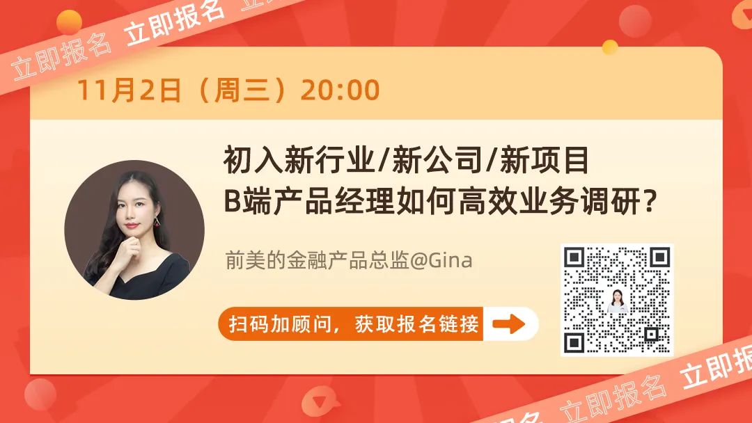 11月2号晚8点,前美的金融产品总监@Gina老师将在线直播,1小时带你掌握一套有高效业务调研的方法!