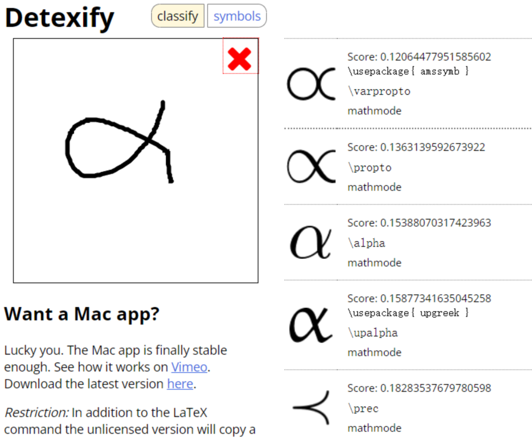 除了 Matcha 外,detexify 也有类似的功能。如果有特殊字符不知道读什么,用 detexify 画出来,就给你latex代码。