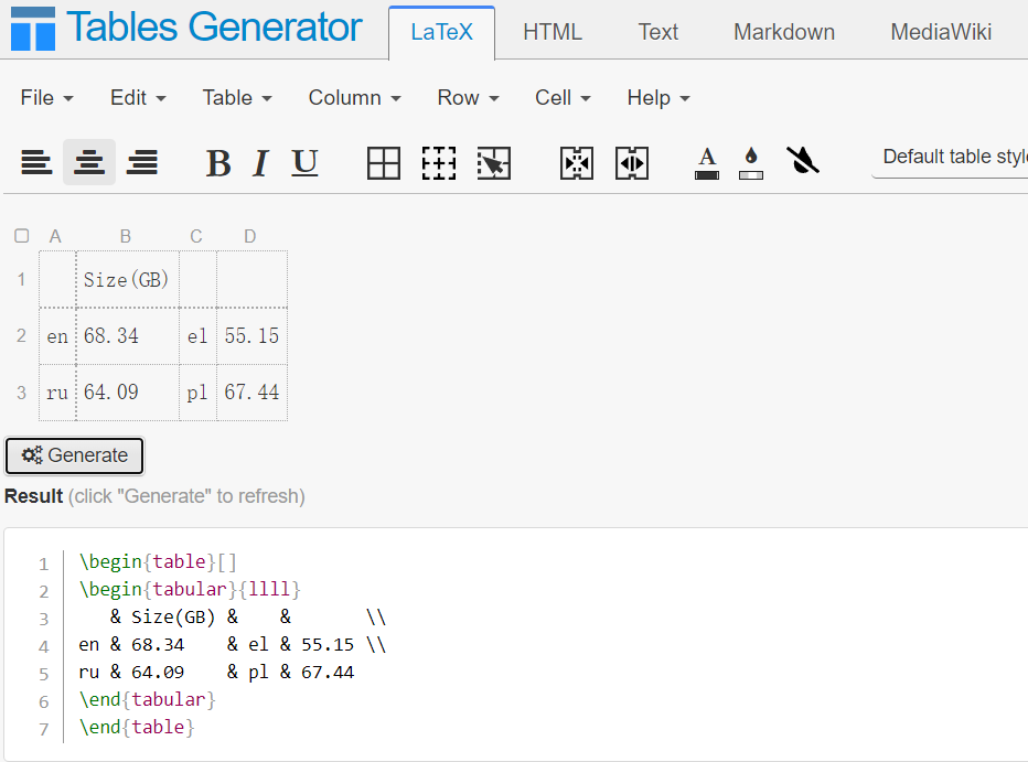 在 demo 中拉出表格,填好数据,generate,就能得到需要的目标语言代码。除了 latex 之外,也支持生成 markdown 和 html 表格代码。
