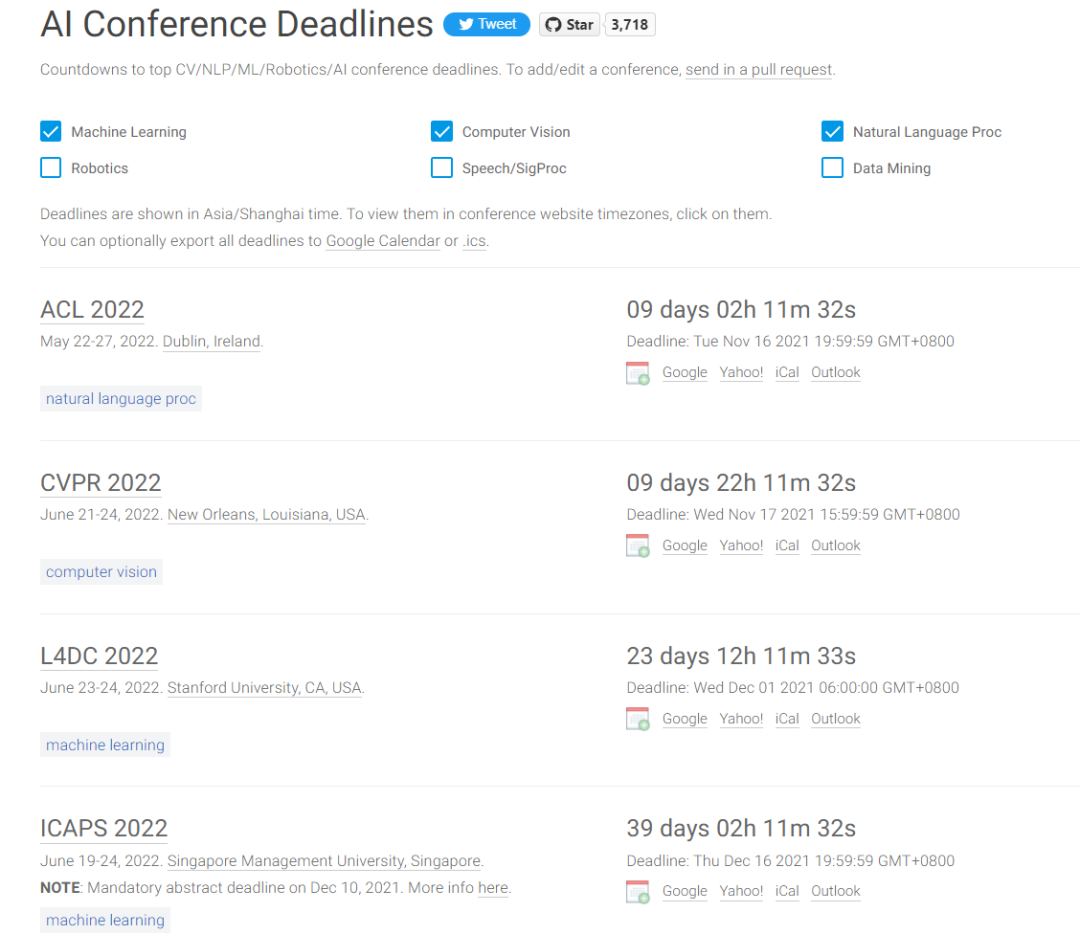 这里是 AI 顶会的 deadline 倒计时,非常全而且准。
