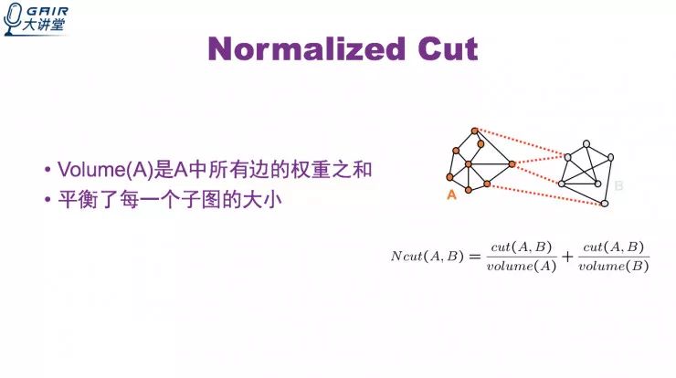 为了克服这个失败,有一篇论文提出了 Normalized Cut。它是在图分割中加入权重参数 Volume。Volume(A) 是 A 中所有边的权重之和。这种方法平衡了每一个子图的大小。