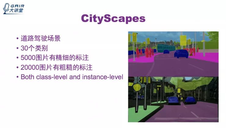主要面向道路驾驶场景,它有 30 个精细的类别。其中有 5000 张图片进行了精细标注,精确到像素级别。还有 20000 张图片有粗糙的标注。它也可以提供语义层面分割和个体层面分割。