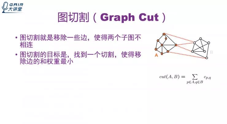 图切割就是移除一些边,使得两个子图不相连;图切割的目标是,找到一个切割,使得移除边的和权重最小。