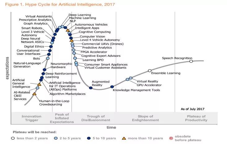 Hype Cycle for Artificial Intelligence, 2017 / 2017年AI的技术成熟度曲线。
