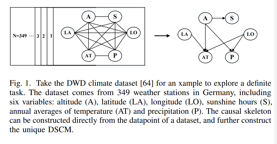 因果关系是一种结果和导致结果的treatment 之间的关系。它在我们的生活中无处不在,涉及到几个领域,如统计学[2]-[5],经济学[6],[7],计算机科学[8]-[11],流行病学[12]-[14],心理学[15],[16]。举一个生活中常见的现象,例如,很多人因为下雨而打伞,或者一个学生因为没有学习而考试考得不好。这种因果关系是因果关系的最简单表达。然而,我们需要意识到统计相关性和因果关系[17],[18]之间的差异。例如,尼龙袜和肺癌在上个世纪同时大量出现,我们只能得出两者之间有相关性而不是因果关系,因为吸烟也在这个时候增加了。近年来,因果关系的研究已成为人工智能领域的重要组成部分,从而克服了基于统计的机器学习[19]-[21]的一些局限性。基于有向无环图(DAG)[22]、[23]结构和贝叶斯模型[24],基于有向无环图(DAG)[22],[23]结构和贝叶斯模型[24],[25],旨在了解两个观测变量在另一个变量影响下的统计关系。此外,因果关系一般可以分为两个主要方面,因果发现和因果结果推断[26],[27]。因果发现[28],[29]侧重于从观测数据中获取因果关系,构建结构因果模型[30],[31],使因果效应推理[32]-[34]可以通过结构因果模型估计变量的变化。因果发现作为因果推理的必要途径和前提条件,近年来备受关注。