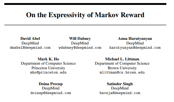 TL;DR:Deepmind、普林斯顿大学和布朗大学的研究员表明可在多项式时间内(polynomial time)确定所需设置是否存在兼容的马尔可夫奖励。