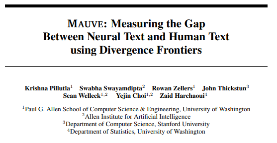 TL;DR:华盛顿大学、斯坦福大学和艾伦人工智能研究所联合提出一种用于比较模型生成的文本和人类生成的文本分布的散度测量方法MAUVE