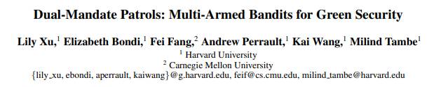 TL;DR:哈佛大学、卡内基梅隆大学的工作。双重任务巡逻:绿色安全的多臂强盗