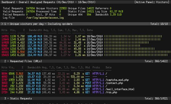 GoAccess 是一个实时的Apache / Nginx / Lighttpd网络日志分析器和交互式查看器,可在终端中运行,为系统管理员提供快速有价值的 HTTP 统计信息,这对在 CLI 上快速查看和分析流量指标非常有用。您还可以通过浏览器访问报告。GoAccess 解析指定的 Web 日志文件,并将数据输出到X终端。GoAccess 是用 C 写的,你只需要ncurses作为依赖。我喜欢这个工具,并且经常在终端中使用。你也可以试一下,不会失望的。
