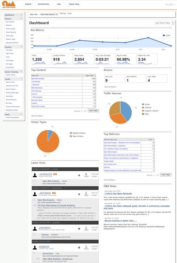 Open Web Analytics (OWA) 是一款开源免费的 Web 分析软件,你可以用来跟踪和分析用户在如何使用你的网站和应用。OWA 基于 GPL 授权,让网站所有者或开发者以一种非常简单的方式向其网站添加分析功能,可以使用 JavaScriopt、PHP 或者基于 REST 的 API。OWA 内建支持对由 WordPress 和 MediaWiki 这类浏览内容管理网站进行跟踪。