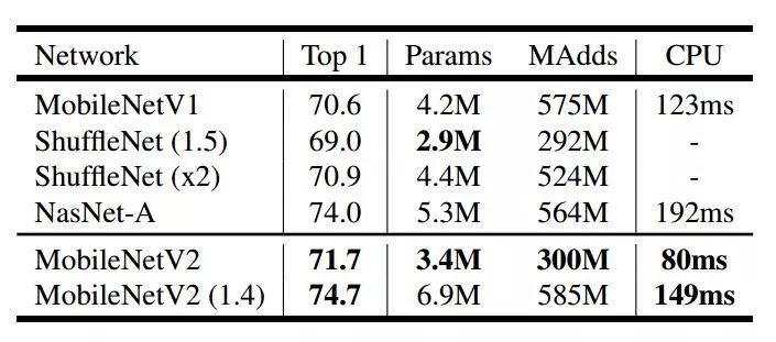 表 3 在 ImageNet 数据集对比了 MobileNetV1、ShuffleNet,MobileNetV2 三个模型的 Top1 精度,Params 和 CPU(Google Pixel 1 phone)执行时间。MobileNetV2 运行时间 149ms,参数 6.9M,Top1 精度 74.7。