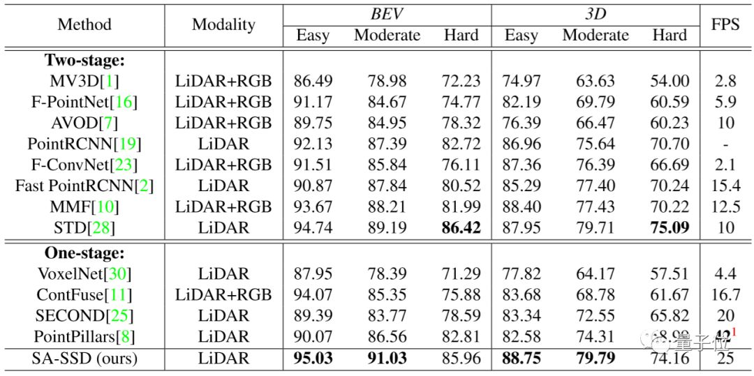 达摩院的研究人员提出一个通用、高性能的检测器,在自动驾驶领域权威数据集KITTI BEV(鸟瞰)上,检测速度达到25FPS ,一举占据榜首,与排名第二的方案相比,减少了一半多,同时精度也远超其他的单阶段检测器。可以说首次实现3D物体检测精度与速度兼得。