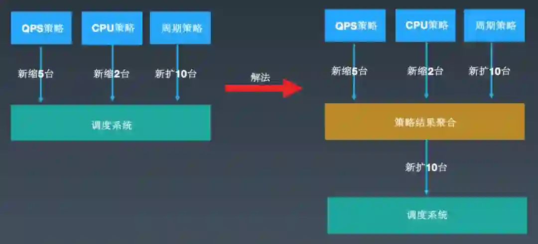 早期的设计是各条策略独自决策,扩容顺序有可能是:缩5台、缩2台、扩10台;也有可能是:扩10台、缩5台、缩2台,就会造成一些无效的扩缩行为。