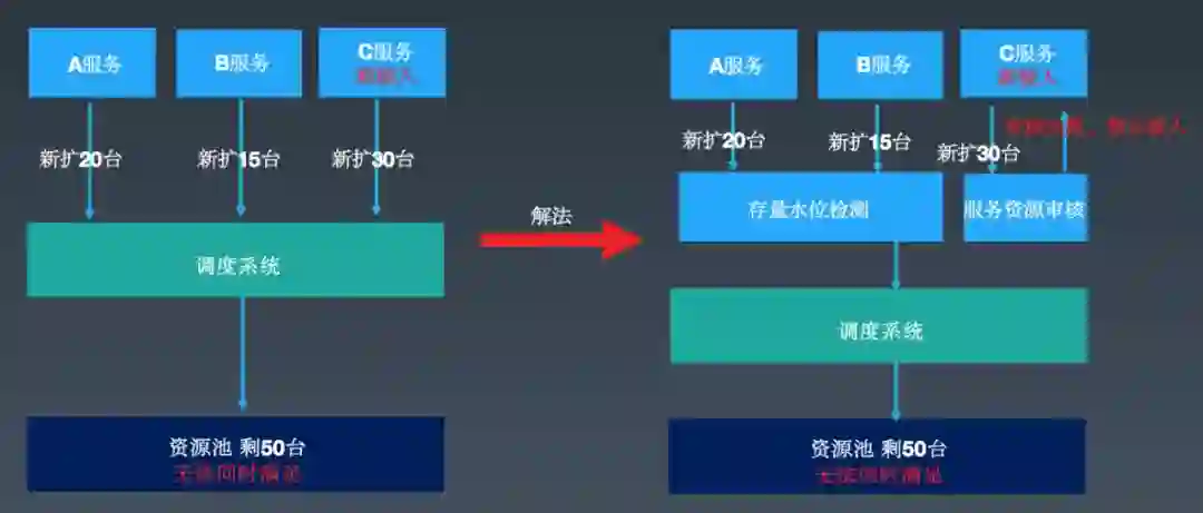 如上图所示,存量中有2个服务,一个需要扩容20台,一个需要扩容15台,这个时候如果新接入一个服务,同一时间需要扩容30台,但是资源池只剩余50台实例了。这个时候就意味着,谁先扩容谁就可以获得资源保障,后发起的请求就无法获得资源保障。