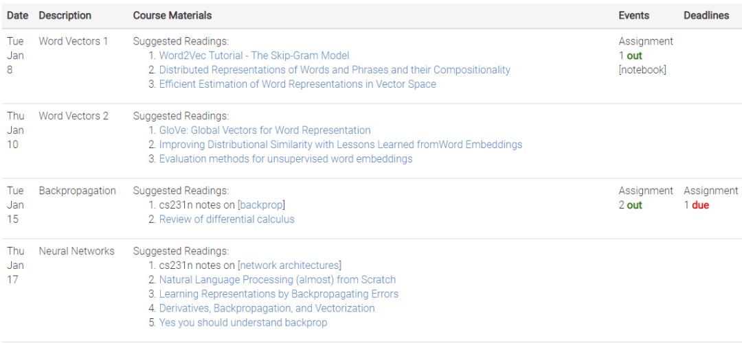 目前CS224n的2019年度课程表已经公布,授课时间从1月8日至3月14日,每周二和周四授课。其中1月份课程的建议阅读材料已经给出。