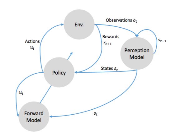在这种情况下,我们不是学习代表状态演化的动态模型,而是学习感觉运动偶然性。此类意外事件表示基于观察(策略)的动作分布,以及给定当前动作-观察对(正向模型)的未来观察的分布。
