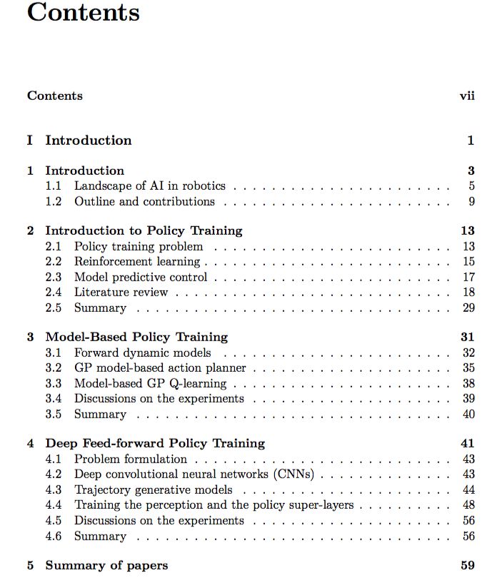 Model-based policy training highly depends on the quality of the model to ob- tain a proper policy. Finding a perfect model of a physical robot is nearly impossible due to the sparsity of data in high-dimensional sensorimotor spaces, noisy measure- ments and partial observability. Furthermore, the model itself can be too restrictive to represent the underlying process. Since the policy is trained based on the infor- mation provided by the model, a small error in the chain of predictions made by the model results in a large error to update the policy. Hence, extra considerations should be taken into account when updating a policy based on a model. We explain our contributions to formulate an efficient model-based policy training in Chapter3.