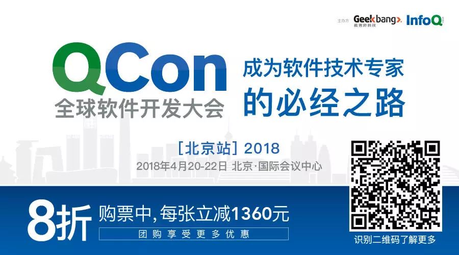 QCon 北京 2018 目前 8 折报名中,立减 1360 元,有任何问题欢迎咨询购票经理 Hanna,电话:15110019061,微信:qcon-0410。