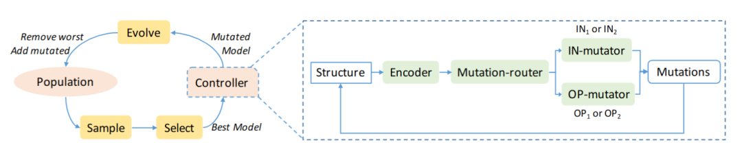 RENAS的主要思路在于:使用可微的强化学习控制器来增强锦标赛选择法的变异机制。