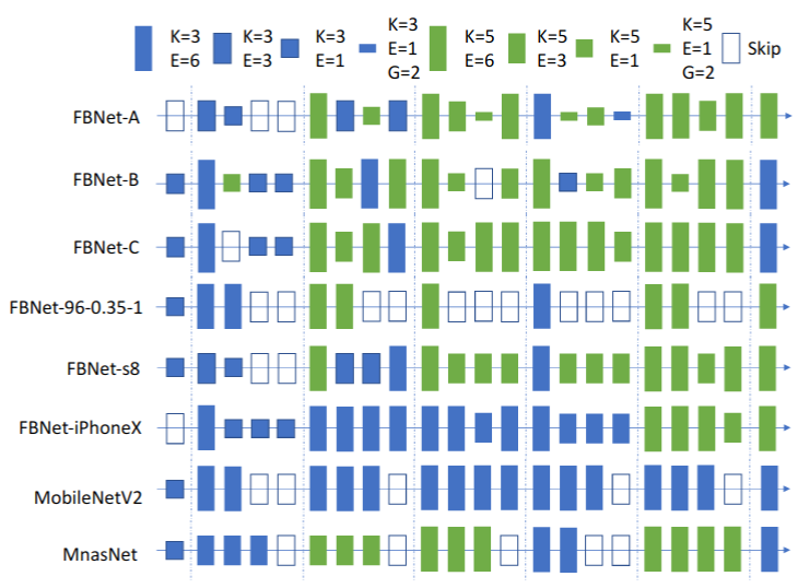 图注:FBNet搜索到的一些网络架构。K代表卷积核大小,E代表放大倍率,G代表卷积分组的参数。图片来源:Wu et. al