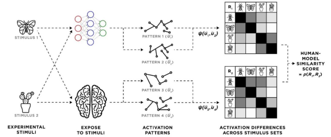 为了定义HMS,作者建立了一种“表示性不相似程度矩阵”(RDM,representational dissimilarity matrix)来量化两个系统(这里是网络与人脑)对一对刺激的响应。给定两个RDM,HMS被定义为二者的斯皮尔曼等级相关系数。
