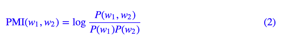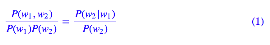 事实上,在NLP的世界里,有一个更加对称的量比单纯的 P(w2|w1) 更为重要,那就是: