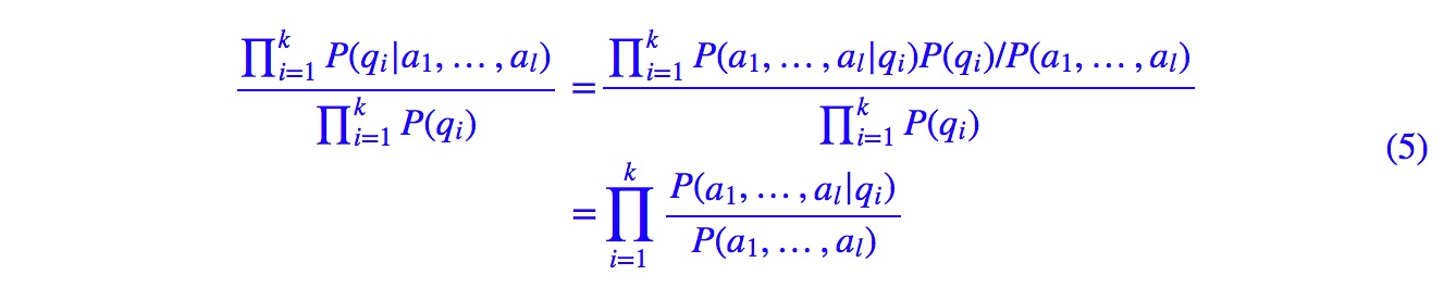 这表明,在朴素假设下,两个多元变量的相关度,等于它们两两单变量的相关度的乘积。如果两边取对数,那么结果就更加好看了,即:
