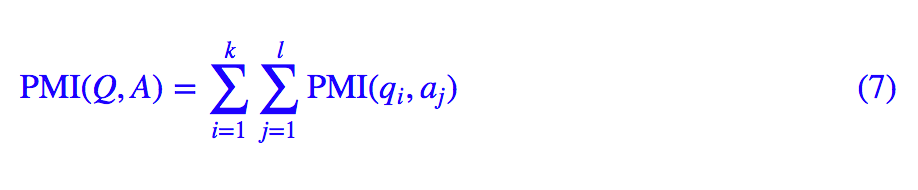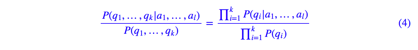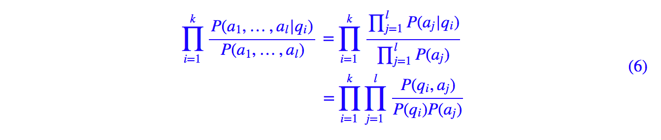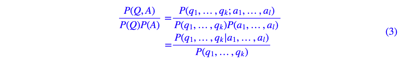 比如,考虑两个量 Q,A 之间的互信息,Q,A 不是单个特征,而是多个特征的组合:Q=(q1,…,qk),A=(a1,…,al),现在考虑它们的相关度,即: