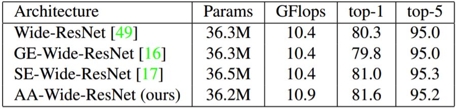表 1:使用 Wide-ResNet 28-10 架构在 CIFAR-100 数据集上的图像分类结果。我们比较了基准模型与参数更少的 Gather-Excite (GE)、Squeeze-Excite (SE) 和新提出的注意增强 (AA) 的 top-1 与 top-5 准确度。
