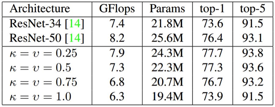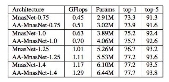 表 3:宽度乘数为 0.75、1.0、1.25 和 1.4 时,基准和注意增强的 MnasNet 的准确度。