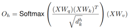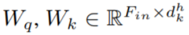 给定一个形状为 (H, W, F_in) 的输入张量,我们将其展开为一个矩阵,并如 Transformer 架构提出的那样执行多头注意。则单个头 h 的自注意机制输出为