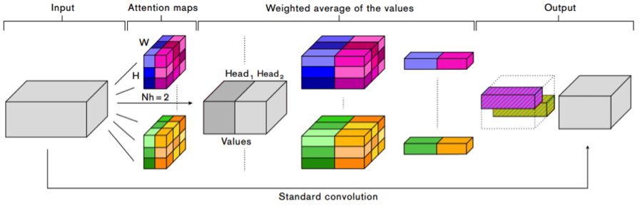 图 2:注意增强型卷积:对于每个空间位置 (h, w),都根据查询和键值在图像上计算出 N_h 个注意图(attention map)。这些注意图被用于计算 N_h 个这些值的加权平均 V。然后将所得结果连接起来,再重新调整形状以匹配原来的体空间维度并与一个逐点卷积混合。多头注意是以并行的方式应用于标准的卷积运算,输出再连接到一起。