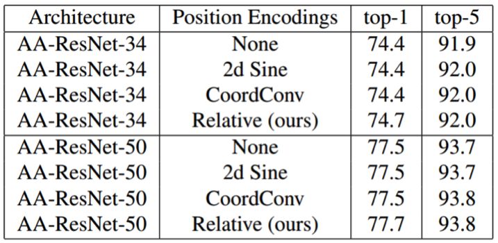 表 7:在 COCO 目标检测任务上,使用 RetinaNet AA-ResNet-50 骨干时注意增强中不同位置编码的效果。