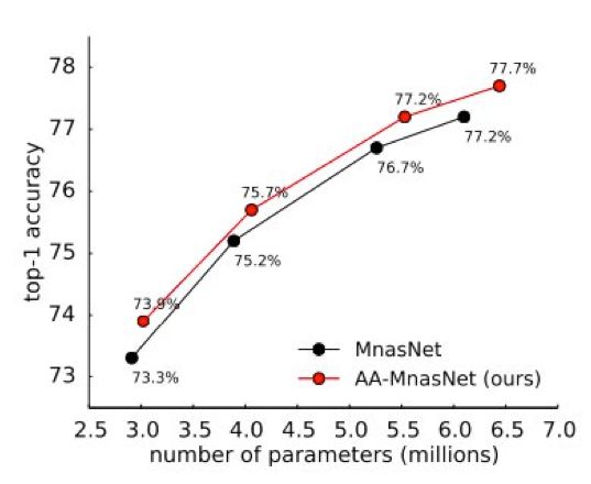 图 4:MnasNet(黑)和注意增强型 MnasNet(红)的 ImageNet top-1 准确度随参数数量的变化,深度乘数为 0.75、1.0、1.25 和 1.4。
